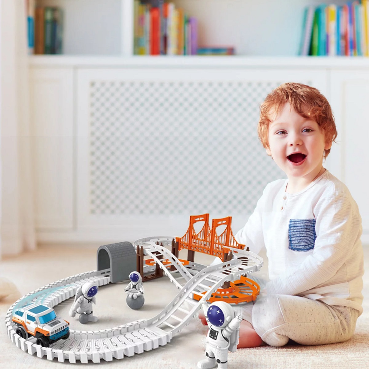 Product details Features:DIY Combination: The dinosaur track set has 39/77 flexible tracks, which can be easily combined, twisted and adjusted in different ways. Children will play according to their own rules, have endless choices, and have unlimited possibilities when building different road tracks, so as to have a good indoor time.High Quality Material: The edges and corners of the rail car track are polished so as not to hurt the baby's hands. Made of safe and harmless materials, the toy train suitable for 3-12-year-old boys can definitely ensure the safety of your children at any time. Well made dinosaur toys are the perfect gift for your children to have a happy time.Outer Space Theme Rail Car: Let your children experience the adventure of outer space. Children can drive cars over bridges, rush to meet astronauts figures. What an exciting adventure!Electrical Car: The toy set includes 1 electrical racing car. Bring children an excellent visual experience. You can control it racing on the bridge.Perfect Gift: Flexible track toy set with outer space theme packaging. It is not only a beautiful gift for the boy's birthday and Christmas, but also can improve the child's practical ability and bring more communication between parents and children.